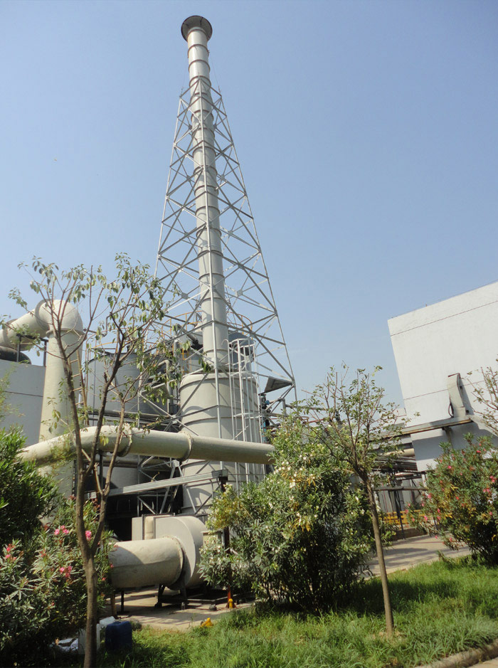 第二級與第一級噴嘴密度不同,噴液壓力不同,吸收酸性氣體濃度范圍也有所不同。在噴淋段及填料段兩相接觸的過程也是材熱與傳質(zhì)的過程。通過控制空塔流速與滯貯時(shí)間保證這一過程的充分與穩(wěn)定。對于某些化學(xué)活潑性較差的酸性氣體,尚需在吸收液中加入一定量的表面活性劑。塔體的最上部是除霧段,氣體中所夾帶的吸收液霧滴在這里被清除下來,經(jīng)過處理后的潔凈空氣從凈化塔上端排氣管放入大氣。