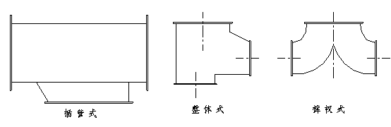 三通或四通的規(guī)格同風(fēng)管尺寸匹配,長度由設(shè)計要求決定。三通分為整體式、插管式和褲衩式三種類型,三通的轉(zhuǎn)向角度由設(shè)計確定。四通一般為直角整體式,也有特殊情況,需現(xiàn)場確定四通管件。